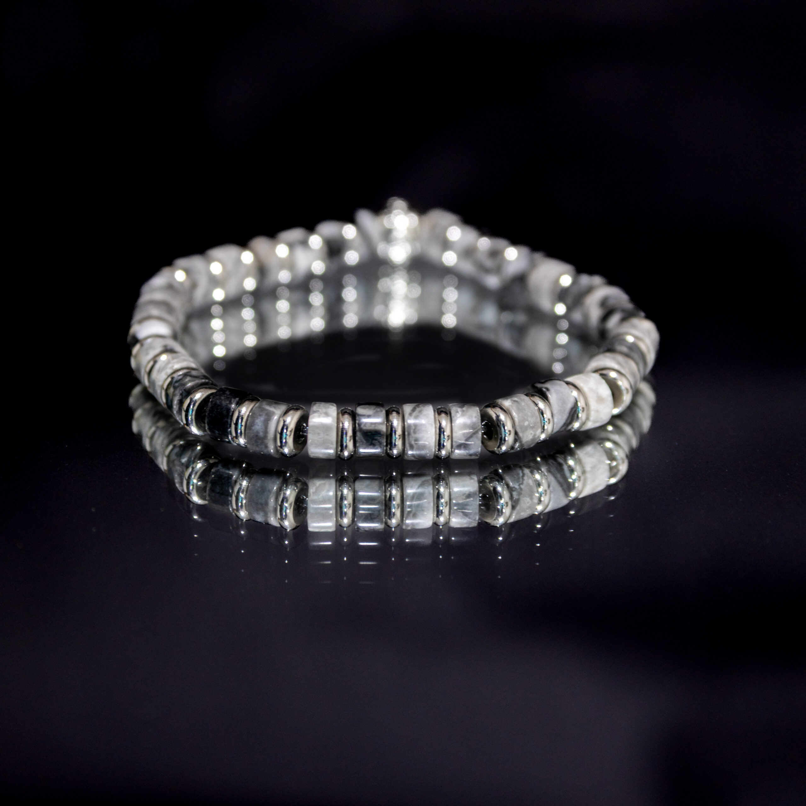 Bracelet en pierre naturelle de Map Stone, symbole de voyage et de connexion à la terre, avec finitions en acier inoxydable.